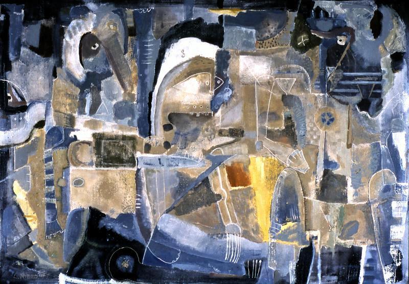 Number- N69 Title: "Secret Gathering" . Medium - Mix media on canvas completed in 1999. Dimension - 47 ½" x 67 ¼" in. 121" x 171" cm. Price- $4200.00 US